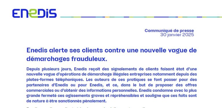 Enedis reçoit des signalements de clients faisant état d’une nouvelle vague d’opérations de démarchage illégales entreprises notamment depuis des plates-formes téléphoniques. Les auteurs de ces
