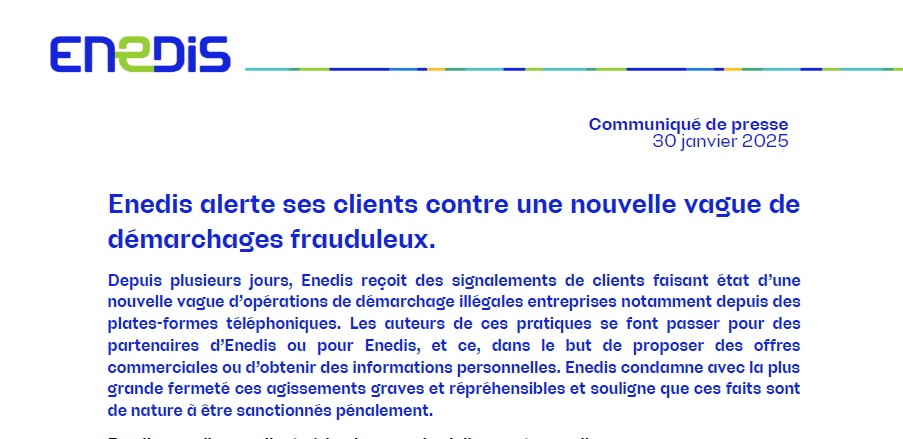 Enedis condamne avec la plus grande fermeté ces agissements graves et répréhensibles et appelle ses clients à la plus grande vigilance.